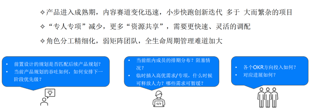 腾讯视频成立以来,经历了探索破局、快速增长等阶段,逐步成为一款步入成熟期、相对稳定的产品。面对外部内容赛道的变化,我们采用“小步快跑”的迭代管理进行综合转型。在这样的背景下,“专人专项”的形式逐渐减少,设计、研发和产品等方面的“资源共享”增多,需要更快速、更灵活地调配资源适应变化。同时由于组织结构趋于成熟、角色分工精细化,腾讯视频的项目多数为跨团队交付。全生命周期的管理难度增大,不同职能成员也会面对不一样的协作难题。