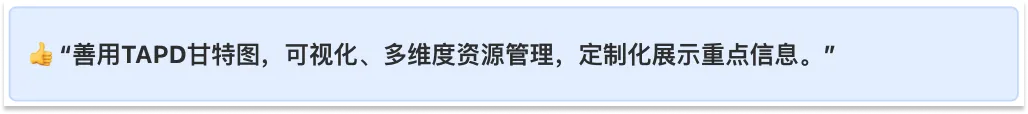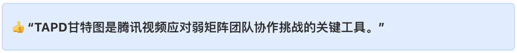 通过以上维度分析,“统一信息源”和“可视化”是帮助腾讯视频高效协作、解决问题的关键,TAPD甘特图正是兼顾两点的合适工具。