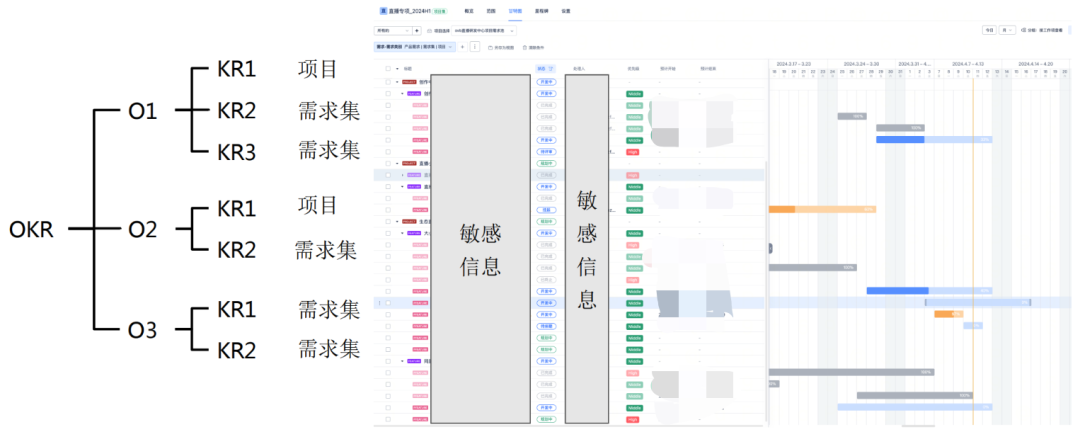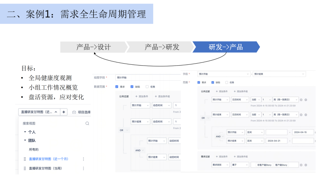 在研发交付的过程中,我们通过 需求结构(项目-需求集-需求)和组织结构、时间圈选 三个维度设计甘特视图,全局观测项目资源分布否符合预期、研发健康度。管理者随时可以查看需求交付情况和研发健康度是否符合预期,不同团队和角色也可以利用甘特图视图对应查看各自的任务情况。