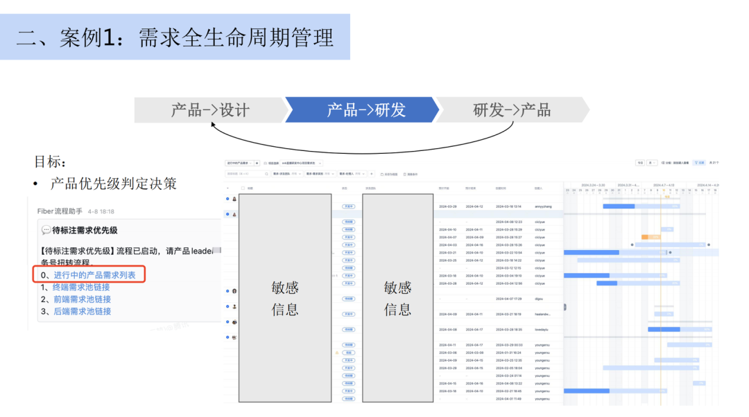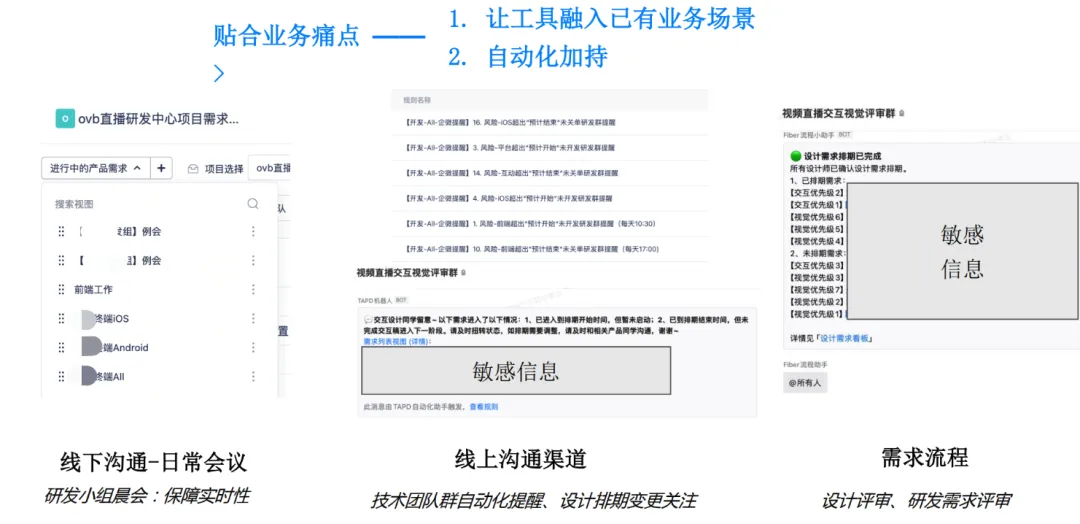 此外,我们会把部分事项嵌入需求流程里,把迭代启动时提醒Leader标注优先级融入到现有的评审和迭代流程,设计团队确认排期后自动化同步到产品设计群(没有排期的需求也会同步展示出来提醒产品),便于大家及时跟进工作。