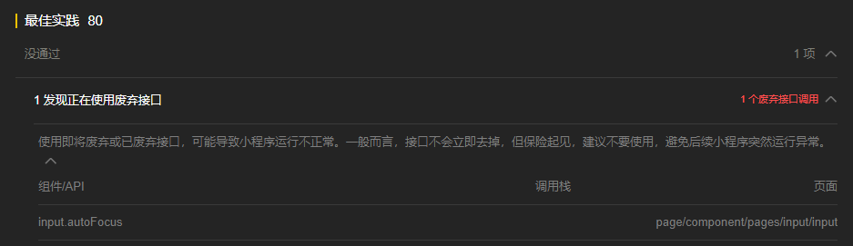 这个问题对一些老旧代码来说很有用,比如示例很久之前写的 auto-focus,由于基本没有改动,所以代码就一直保持不变。使用体验评分的时候检测到了这个属性是废弃属性,所以我们更换了可用属性 focus 来解决问题。