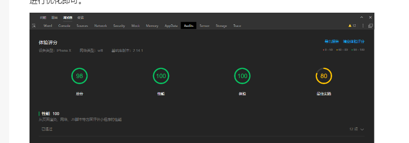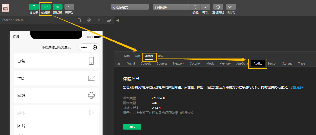 使用开发者工具打开小程序,调试器区域切换到 Audits 面板,就一个“运行”按钮,点它。