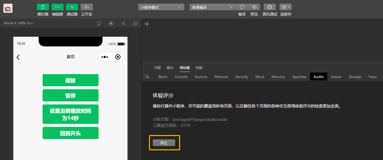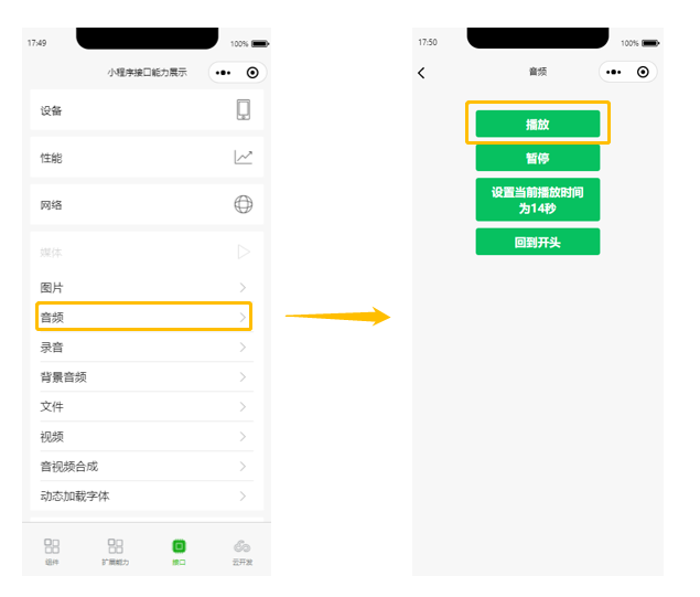然后在工具上对小程序进行操作,比如:我点开了 “接口 - 媒体 - 音频 - 播放 ”。