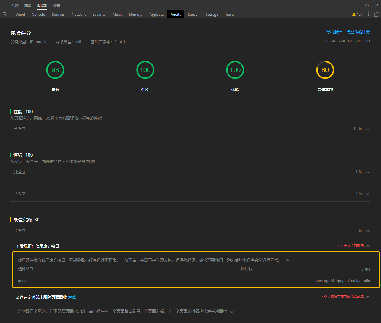 看第一条是 “发现正在使用废弃接口”,报告已经很清楚的告诉我们使用了废弃组件 audio,我们根据报告进行优化即可。