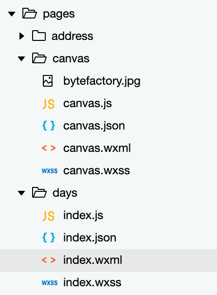 下面就接着上一篇的例子,继续完善程序,我们在 pages 目录下,新建 days 目录,然后在 days 目录下,新建 Page index 用来显示日期列表,目录结构如下图: