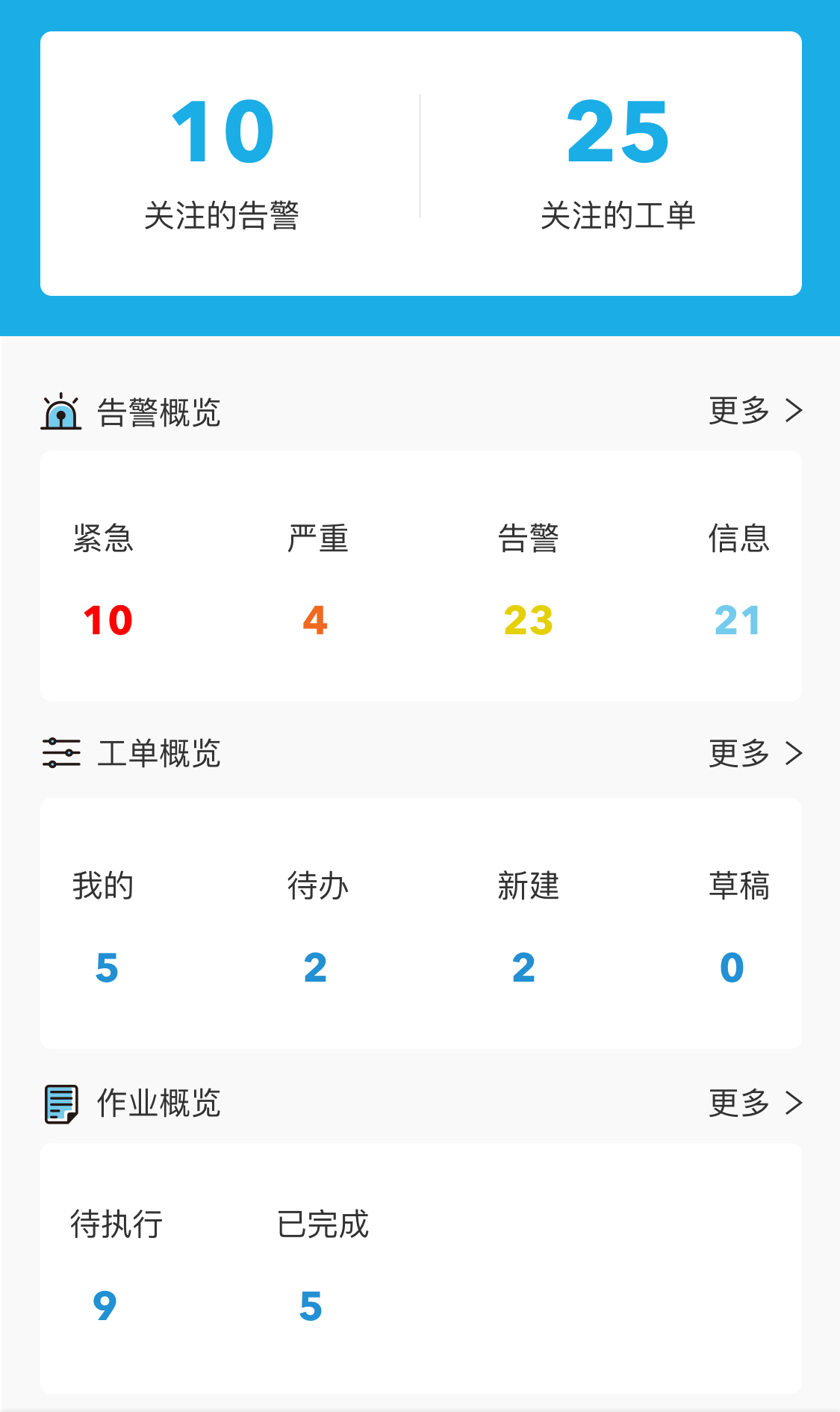 实现终端移动运维,实时查看运维工作相关告警数据、工单数据、运营数据。实现便捷流程处理、线上巡检等功能。同时可做为线下多个运维数据(资产数据、监控数据)的采集终端和计算终端,实现移动运维和网络运维的模式。