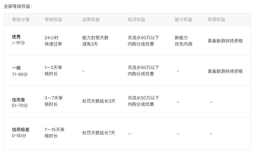 3. 资源权益:信用等级优秀或一般的主体,名下的小游戏在符合申请条件时可获得新游戏申请公测的资格。