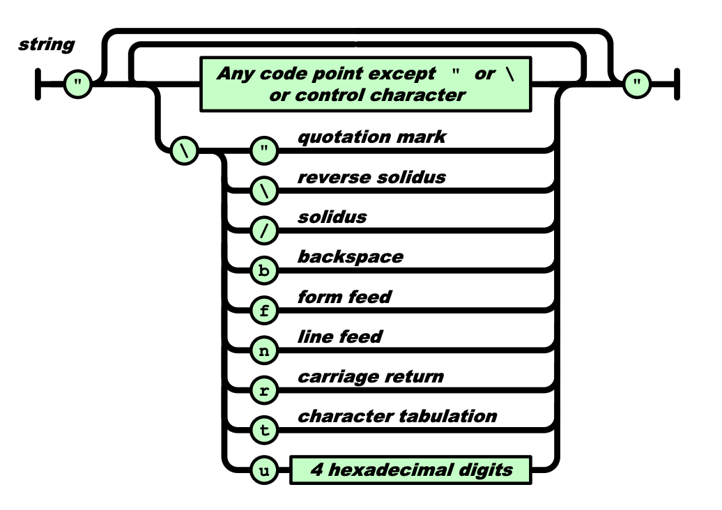 A string is a sequence of Unicode code points wrapped with quotation marks (U+0022). All code points may be placed within the quotation marks except for the code points that must be escaped: quotation mark(U+0022), reverse solidus (U+005C), and the control characters U+0000 to U+001F. There are two-character escape sequence representations of some characters.