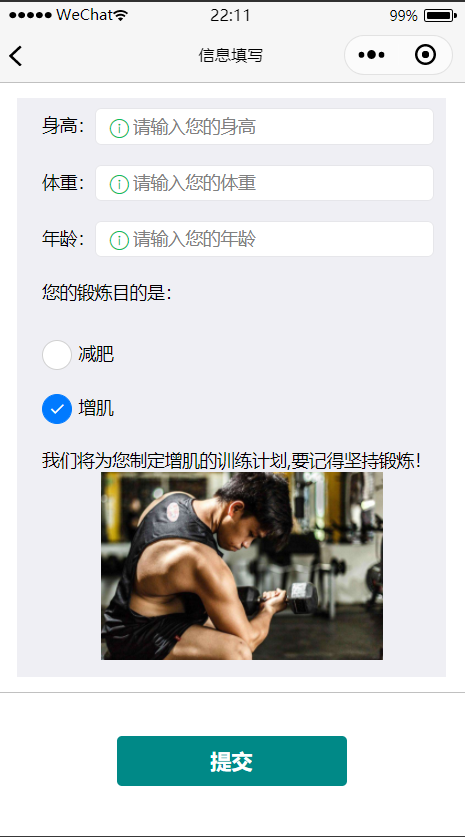 目标用户:该小程序面向的目标用户是想减肥和想健身的人群。小程序会根据用户的输入的身高、体重、年龄以及选择的锻炼方向为用户制定方案。