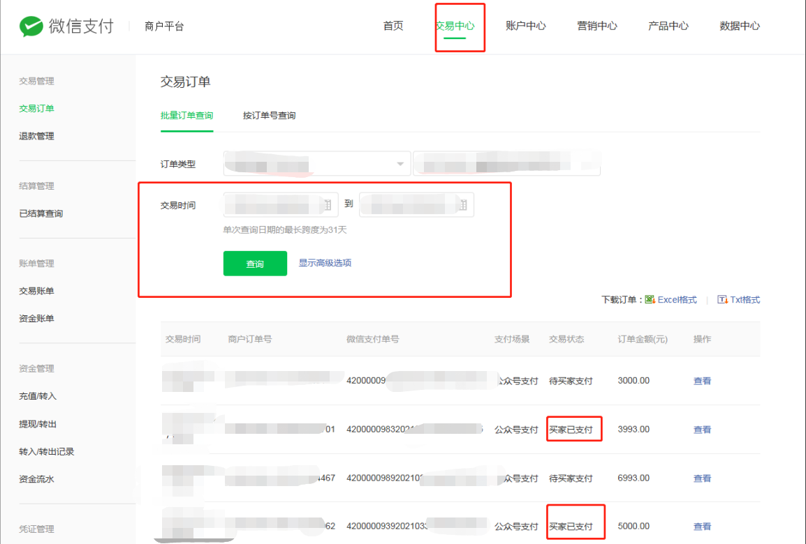 - 三笔订单单号查询:微信支付商户平台--点交易中心--输入时间--查询(选支付成功的 如下图)
