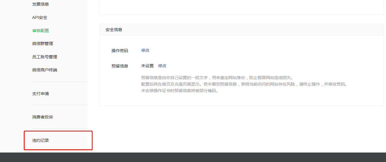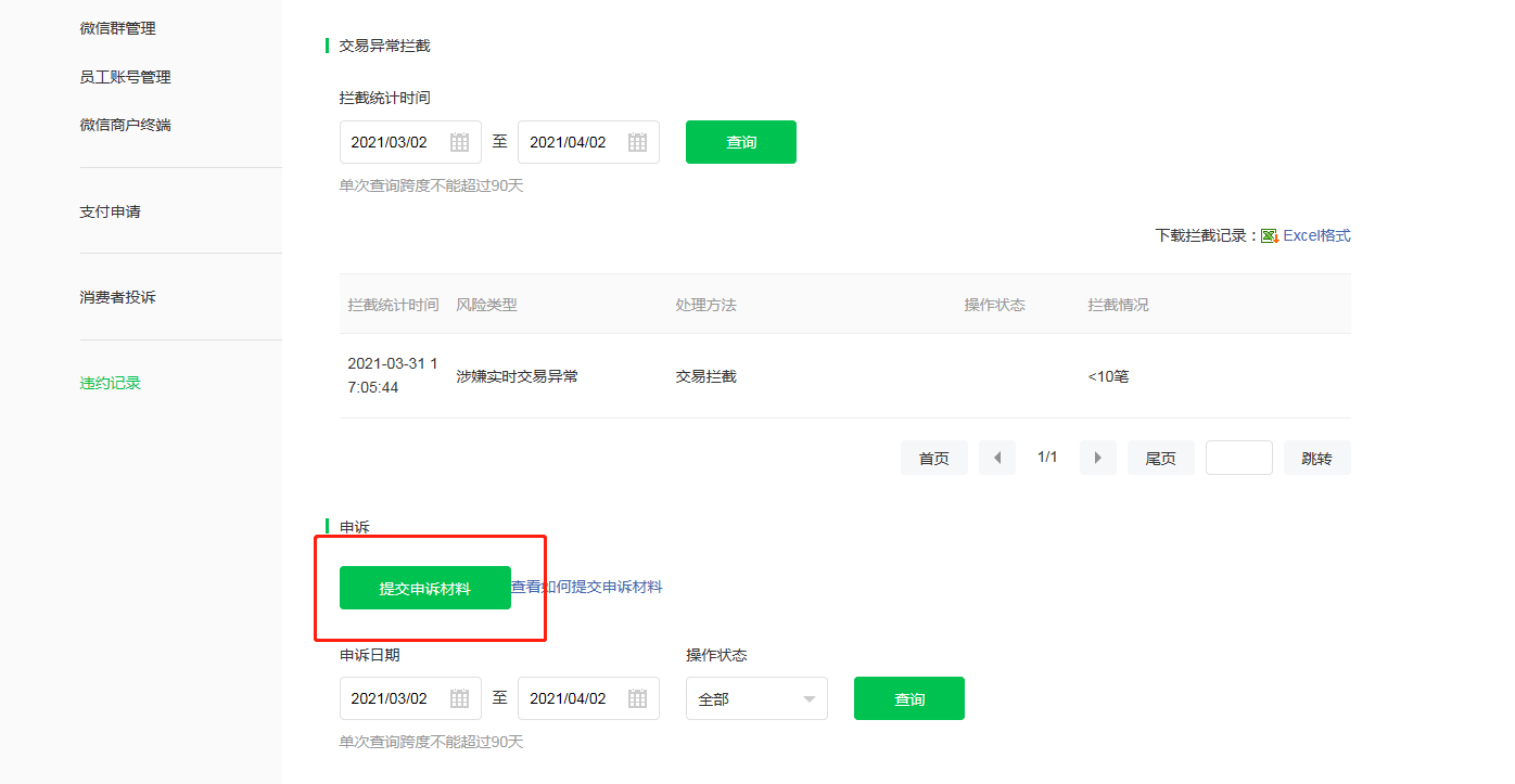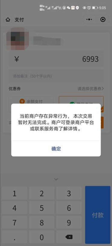 - 顾客支付时出现支付限额提示后--商家可登录微信支付商户平台(https://pay.weixin.qq.com/)--查看原因--查看违约记录--提交申诉处理排除异常。