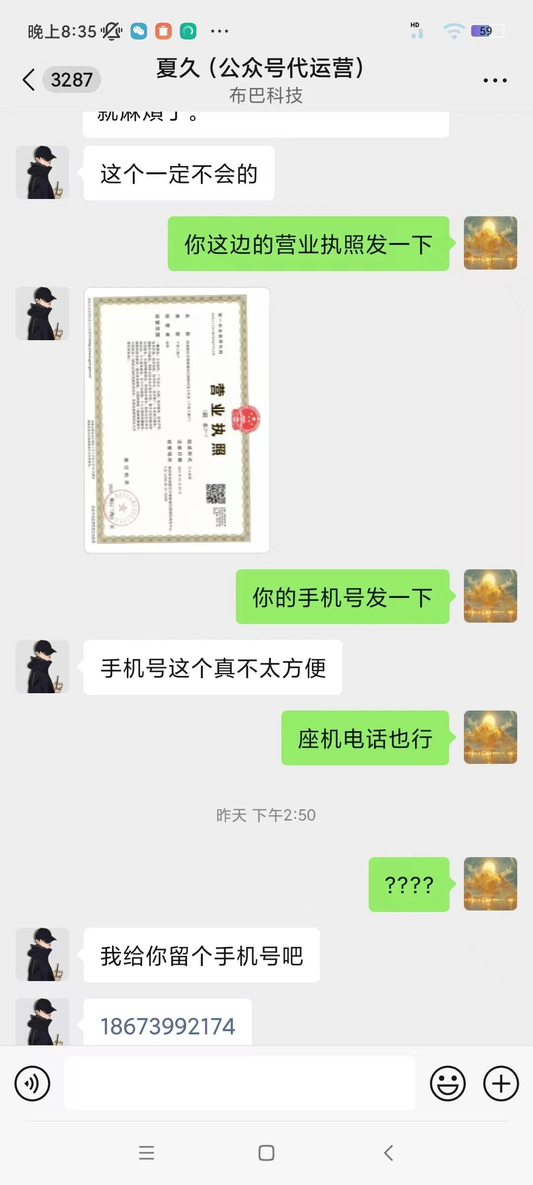 本人为上述公众号的合法拥有者及管理员。近期与一名自称“公众号代理运营公司”的人员合作,对方使用企业微信(已认证)与我沟通,并提供了营业执照照片及手机号等资质信息,我基于这些表面可信的资料,将其添加为公众号授权运营者。
