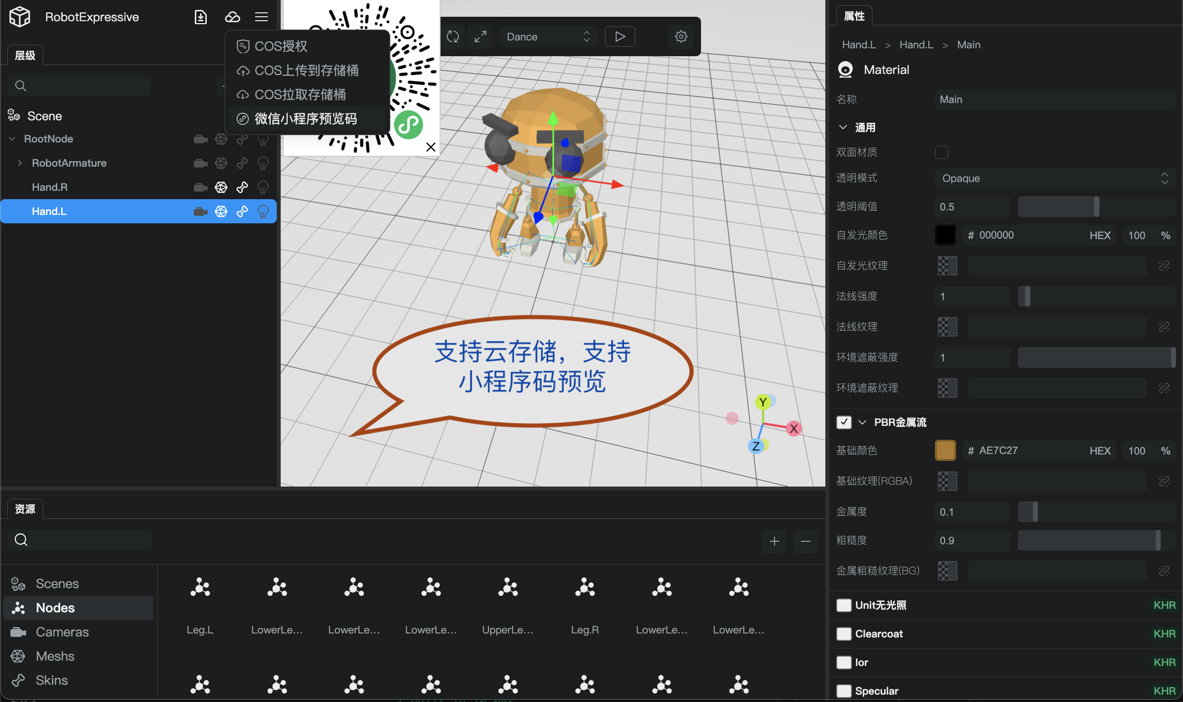 <xr-asset-material asset-id="big" effect="standard" states="alphaMode:BLEND" uniforms="u_baseColorFactor: 0.8 0.6 0.4 0.8" renderQueue="2200" /><xr-asset-material asset-id="small" effect="standard" uniforms="u_baseColorFactor: 0.1 0.9 0.1 1" renderQueue="1" /><xr-meshid="cylinder"position="-1.5 0 0" scale="1 1 1"geometry="cylinder" material="big"cube-shape="autoFit:true" bind:touch-shape="handleTouchCylinder"/><xr-meshposition="-1.5 0 0" scale="0.1 0.5 0.1" rotation="90 0 0" material="small"geometry="cylinder"/>感谢感谢!之前就想着有没有类似的gltf预览工具,这个还能调整位置并保存,非常有用!