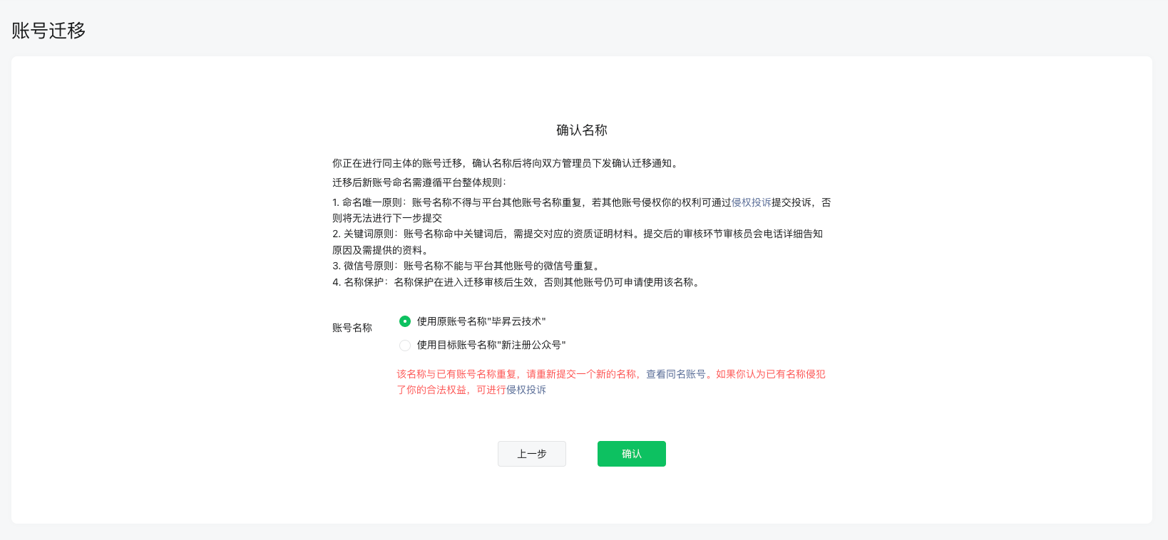 在服务号数据迁移到公众号时,提示“该名称与已有账号名称重复,请重新提交一个新的名称,查看同名账号。如果你认为已有名称侵犯了你的合法权益,可进行侵权投诉”,我点击“查看同名账号”,显示空白页,无法下一步,麻烦处理一下。