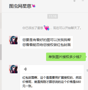 就直接通过了!为此,我找了一圈能够授权的使用微信红包封面的素材网站。模式都是单张图片授权,一张图片要680元!还有收费800多的,