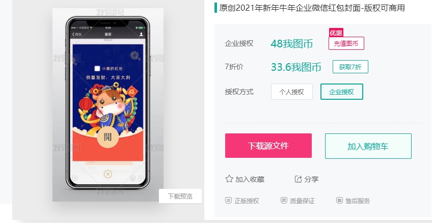 终于让我发现了,一家素材可以授权使用微信红包封面,而且价格低。最重要的是节省了时间,有希望年前搞定红包封面