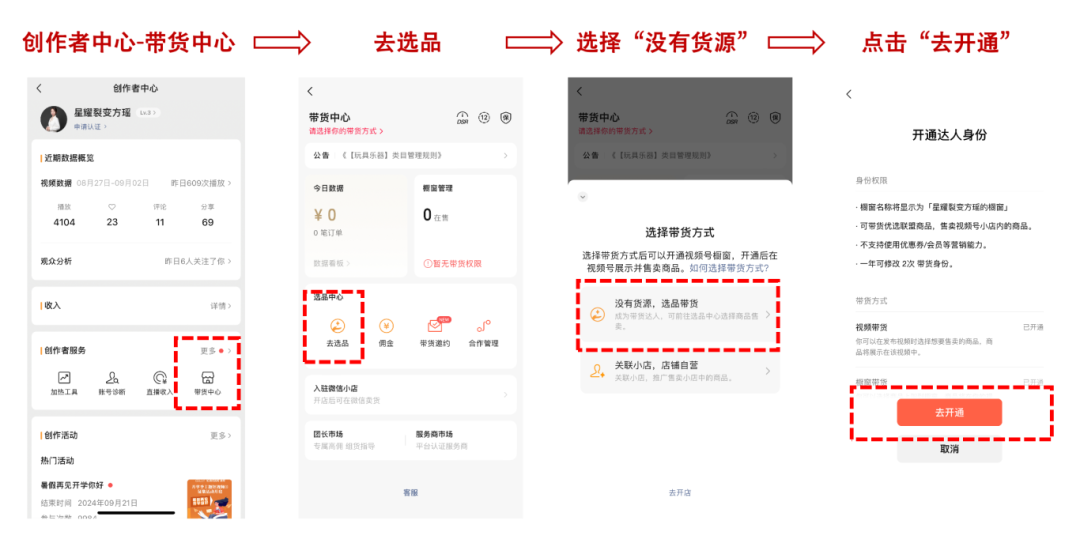 达人要带货需要先开通橱窗,有了橱窗才能选品带货。橱窗开通路径:视频号创作者中心—>带货中心—>去选品—>选择没有货源—>点击【去开通】。