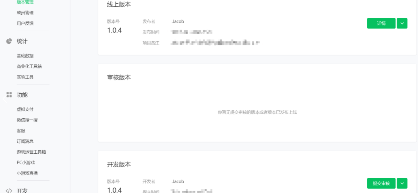 3)在MP平台的版本管理中可查看当前版本信息,可设置体验版,也可提交审核,审核通过后可提交正式版本!