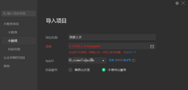 1)点击小游戏,点击加号,填入导入项目的信息