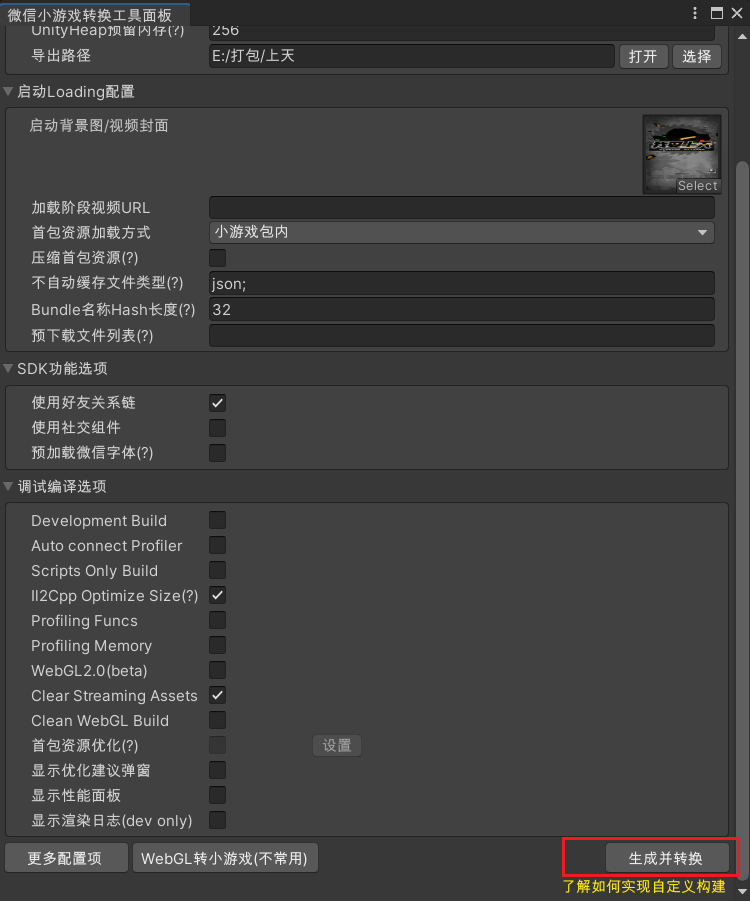 根据自己实际情况填写以上内容,图片中填写的内容为必填内容,最后点击导出webgl并转换为小游戏即可