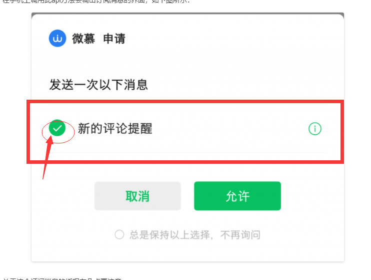 1) 在确认提示框里,如果用户选择“取消”表示拒绝(取消)订阅消息,选择“允许”表示用户订阅一次消息。
