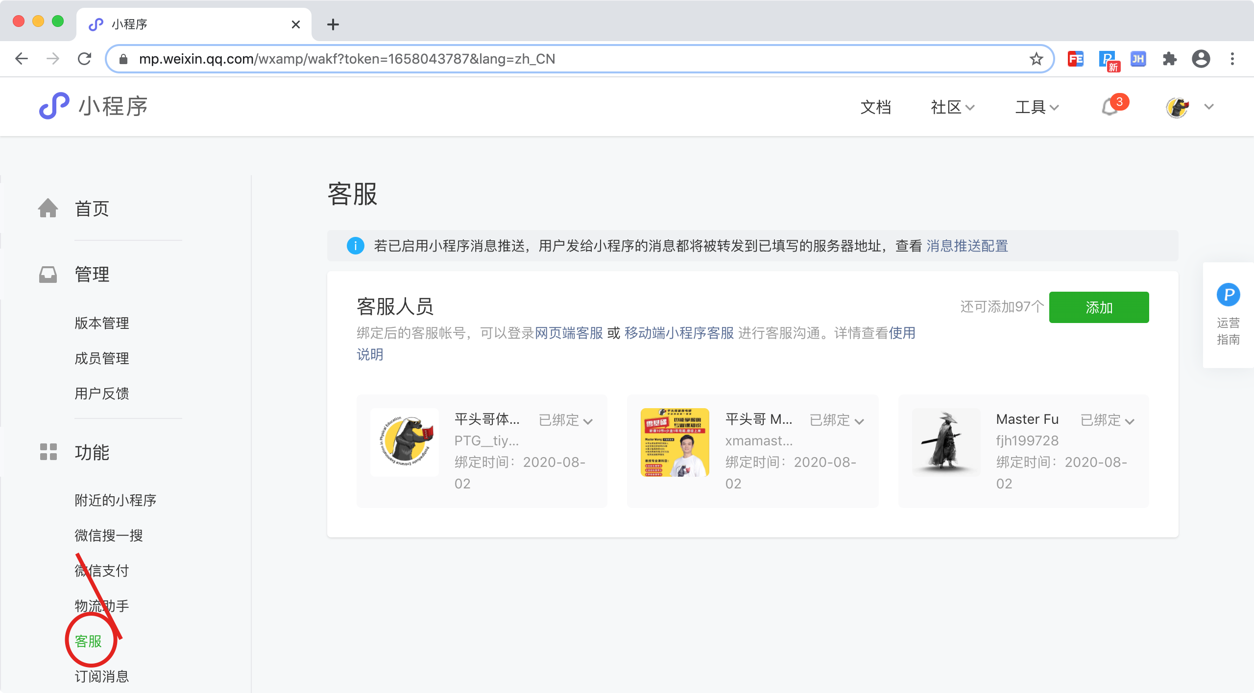 本文主要描述了具体如何开通小程序的客服功能,在这里有一点非常容易忽略,那就是客服消息不会推送给你,除非你客服小程序里面设置为在线状态。