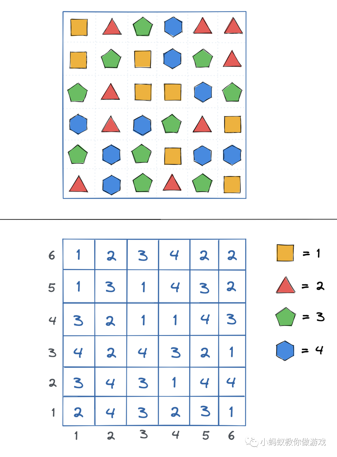 如图,网格中不再是空空如也了,而是填满了数字。这些数字是根据什么来填的呢?看一下右侧,我们用 1 表示黄色的正方形,2 表示红色的三角形,3 表示绿色的五边形,4 表示蓝色的六边形。然后对照着上方的游戏界面,我们将这些数字填入到了下方的这个网格中。接下来,我们的注意力将都会放置在这张填满数字的网格上,因为我们将借助它来完成查找,匹配,以及后来的消除和移动等操作。