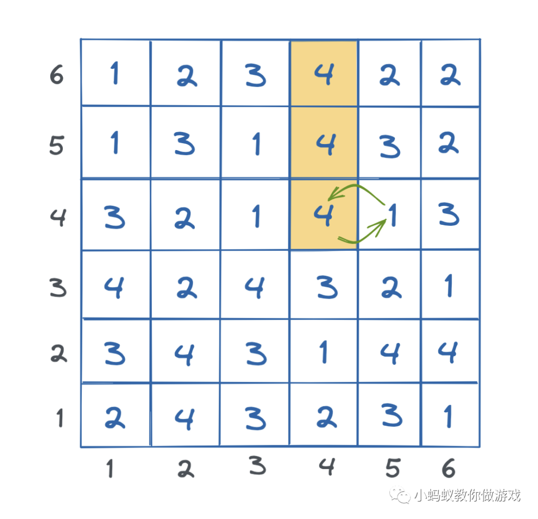 如图,我们将第 4 行第 4 列的 “1” 和第 4 行第 5 列的 “4” 进行交换,交换之后,竖直方向上的 3 个数字 4 相等,此时就满足消除消除条件。