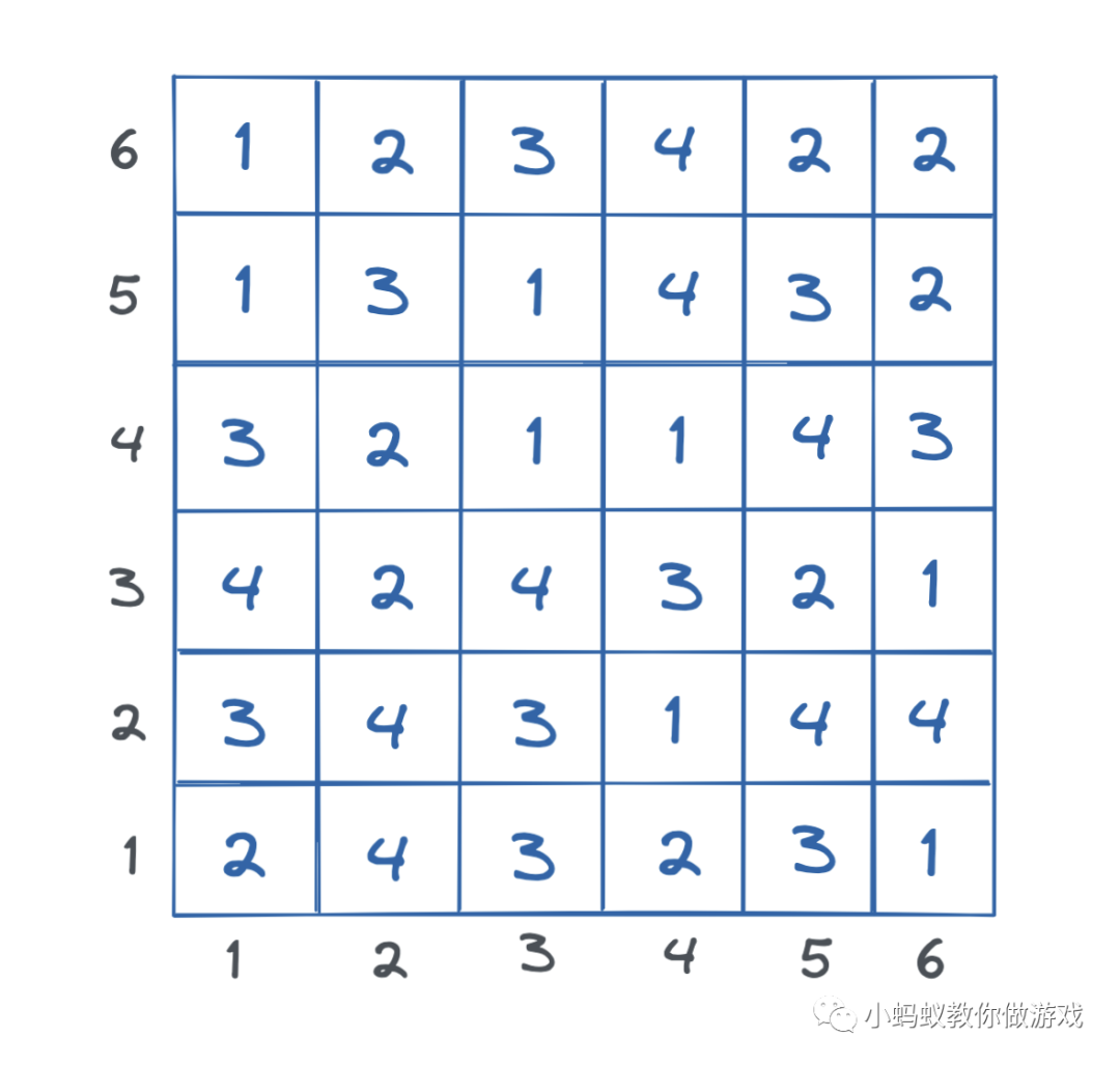 我们如何在游戏制作时构建这张填满数据的网格呢?仔细再看一下这个网格,它是不是很像是一个表格,二维数组,数组的数组......根据你所使用的编程语言和游戏制作工具的不同,一定都能找到对应的数据类型来呈现出这样的一个布满数据的表格。