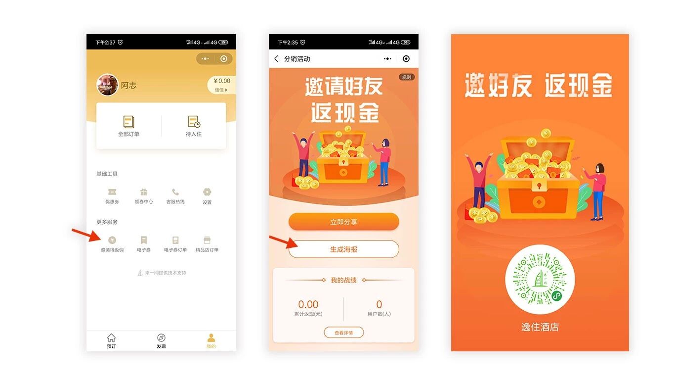 上图小程序酒店后台看到,新人红包和分销两个功能。大流量主,用自己的分销码或链接告诉粉丝某酒店有新人红包。是不是非常恰当的理由?这里要注意的细节是,除了推广者有好处,消费者也必需要有好处。比如我们经常看到的:分享好友,各得 ## 元。