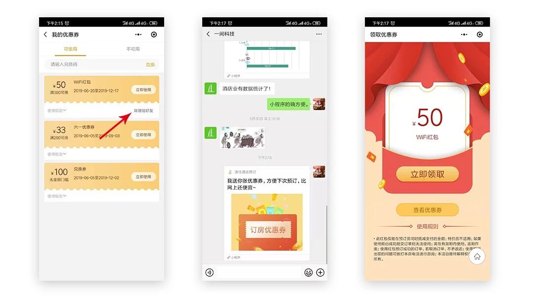 优惠券除了订酒店有优惠这个基础功能外,还有转赠功能。裂变中的赠品流通起来,就产生了二次裂变。最终会有大部分流到要用的人手里。裂变最终效果就是从这些小细节中拉开差距。
