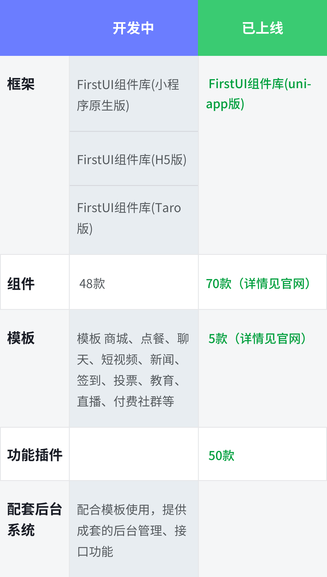 FirstUI(https://www.firstui.cn/)是基于uni-app开发的一款轻量、全面可靠的跨平台移动端组件库。包括框架、组件、模板、功能插件几个部分。FirstUI开发者、设计师不断精心打磨,持续发布新的组件、模板等新功能,力求为用户提供更高品质的产品,节约用户时间与成本。