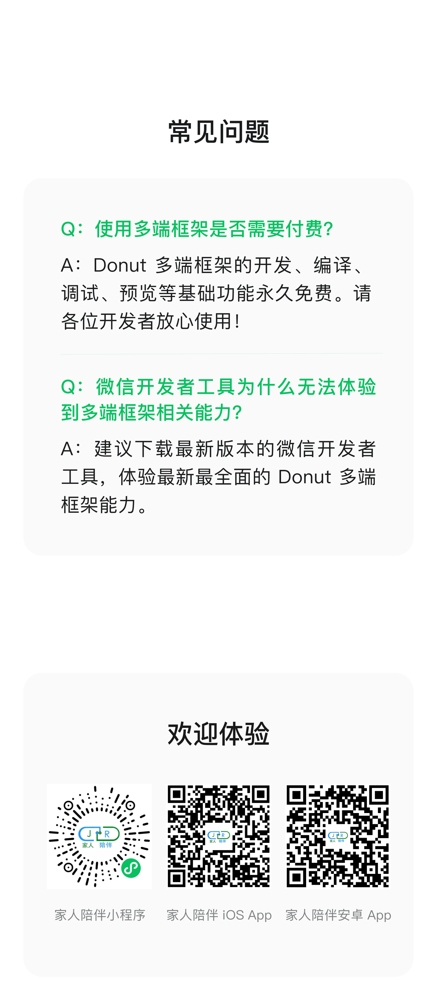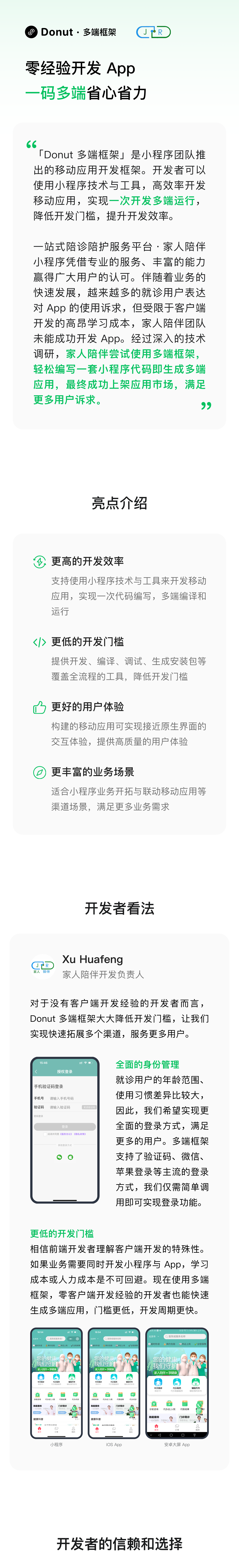 一站式陪诊陪护服务平台 · 家人陪伴小程序凭借专业的服务、丰富的能力赢得广大用户的认可。伴随着业务的快速发展,越来越多的就诊用户表达对 App 的使用诉求,但受限于客户端开发的高昂学习成本,家人陪伴团队未能成功开发 App。经过深入的技术调研,家人陪伴尝试使用多端框架,轻松编写一套小程序代码即生成多端应用,最终成功上架应用市场,满足更多用户诉求。