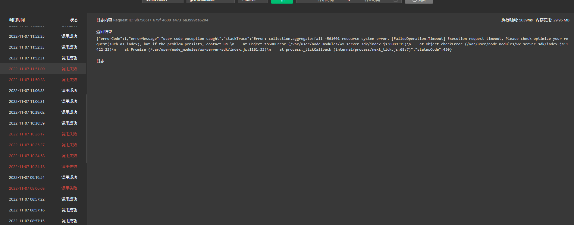 {"errorCode":1,"errorMessage":"user code exception caught","stackTrace":"Error: collection.aggregate:fail -501001 resource system error. [FailedOperation.Timeout] Execution request timeout, Please check optimize your request(such as index), but if the problem persists, contact us.\n at Object.toSDKError (/var/user/node_modules/wx-server-sdk/index.js:8089:19)\n at Object.checkError (/var/user/node_modules/wx-server-sdk/index.js:1422:23)\n at Promise (/var/user/node_modules/wx-server-sdk/index.js:1161:33)\n at process._tickCallback (internal/process/next_tick.js:68:7)","statusCode":430}