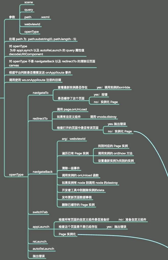 在小程序中切换页面或打开页面时会触发 onAppRoute 事件,小程序框架通过 wx.onAppRoute 注册页面切换的处理程序,在所有程序就绪后,以 entryPagePath 作为入口使用 appLaunch 的方式进入页面。