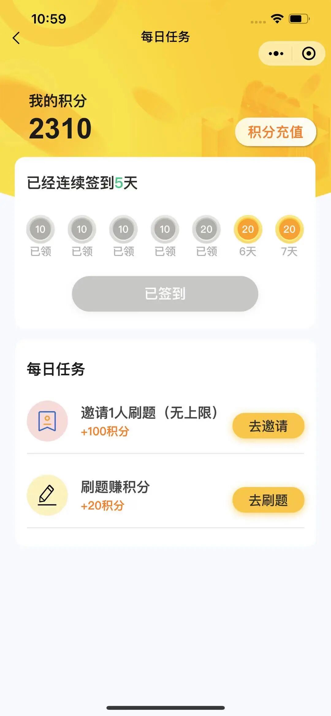 最近在实现小程序的积分签到打卡的功能,连续签到5天以上下发的积分是不一样的,所以有几个难点就是