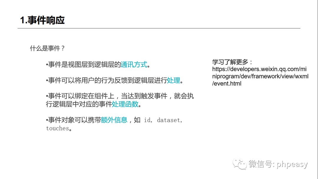 那么首先我们来了解一下什么是事件。事件严格来说并不是js中的一个概念,而是在视图层,是视图层到逻辑层的通讯方式。它可以将用户的行为反馈到逻辑层进行处理。也就是说,事件是在wxml中,通过绑定在组件上,当出现触发事件,就会执行逻辑层中对应的事件处理函数。对应的这个处理函数,就是事件响应,写在页面的js文件中。通过绑定,能够从wxml页面中传递给js很多信息,如id,dataset,touches等。