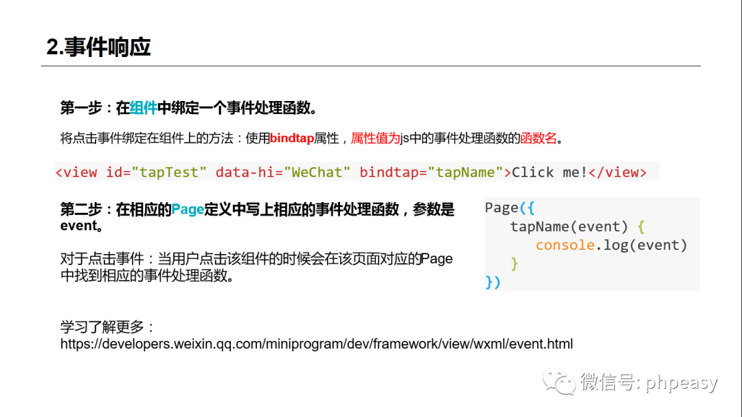 这里我们讲了最常见的点击响应,而对于事件响应还有很多,比如对于输入框组件,就会有聚焦和失焦的事件。用户点击输入框后光标开始闪烁,此时系统输入的定位点在输入框,我们才能输入,这个过程称之为聚焦,相反就是失焦。于是我们就可以利用这两个事件,比如每次失焦后可以获取一下输入内容,获取的代码就要写在失焦事件的响应函数中。关于事件的更多内容,大家可以访问微信开发者文档进行学习,也就是右上方这个链接。
