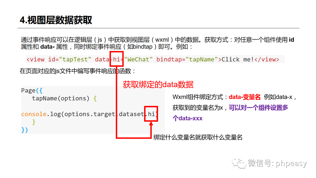 此外,我们也可以在页面对应的js文件中编写事件响应的函数,通过这种方式来获取绑定在组件上的data值。wxml组件绑定方式为data-变量名,例如data-x,获取到的变量名为x,可以对一个组件设置多个data-xxx,横杠后面是变量名称,每一个data杠x都是一个独立的属性,因此我们可以绑定很多变量,绑定什么变量名就获取什么变量名。