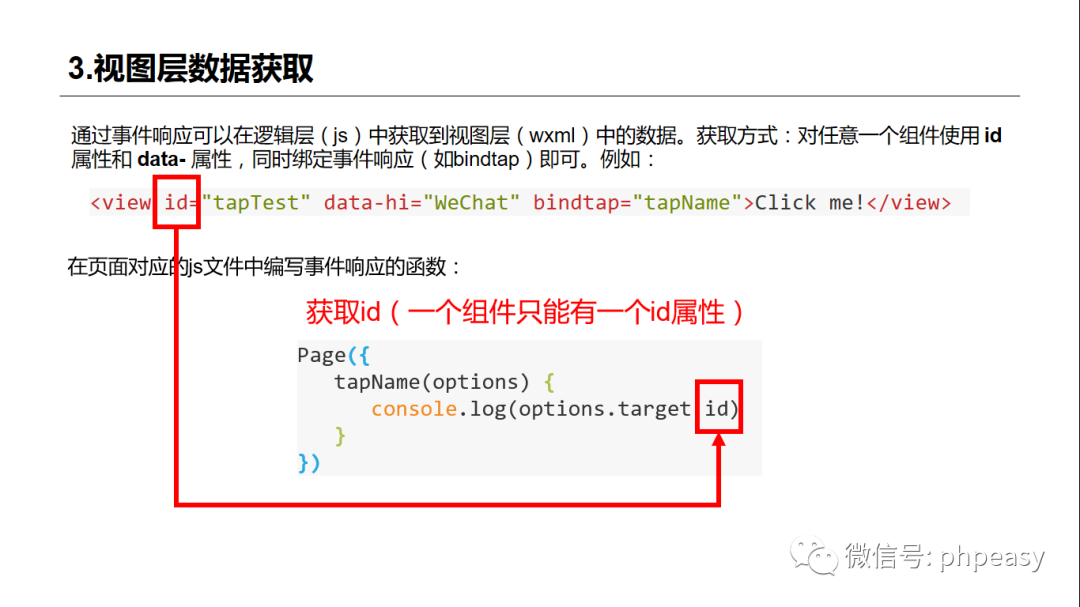 那么,通过事件响应可以在逻辑层(js)中获取到视图层(wxml)中的数据。获取到的数据分为两类,一种是id数据,另一类则是date-数据。获取数据的方式类似,对任意一个组件使用id属性和 data-属性,同时绑定事件响应(如bindtap)即可。