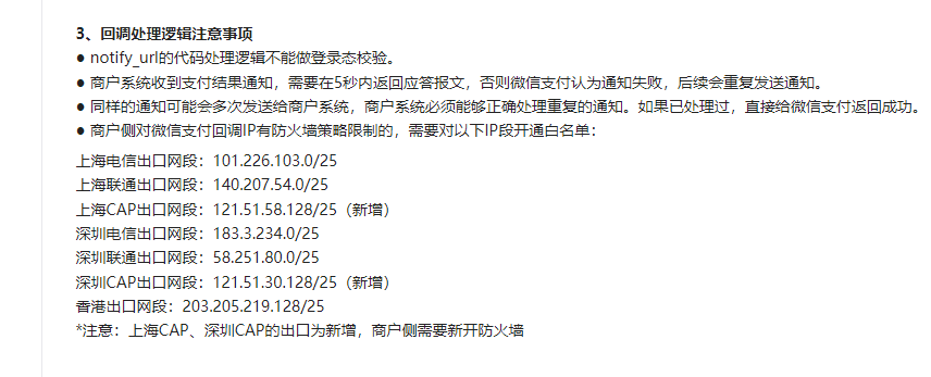 情况三(硬性条件,不要抱着侥幸心理!!!):回调地址不规范,回调地址规则:回调地址不能携带参数及端口号且不能是直接的ip,域名不能携带特殊符号(比如-等),请检查下单时的回调地址是否有携带参数或端口号,必须为 公网域名 且是 https 开头,现使用 http开头 、携带 端口号 或是 ip 能正常接收回调的用户,建议更换为 https 且去除 端口号 使用正常的域名,避免后期出现回调通知无法接收的情况,请求方式为post请求。