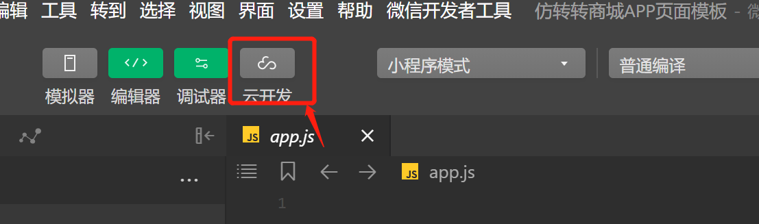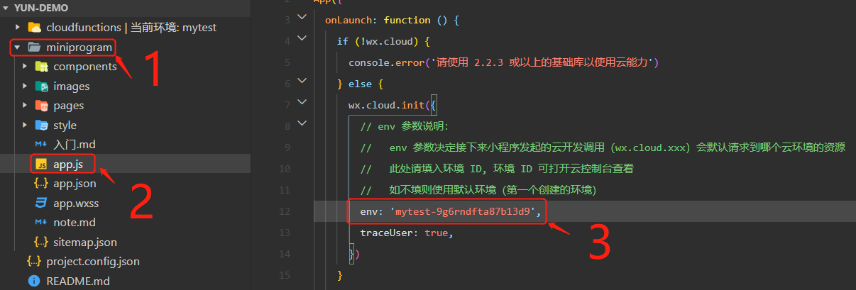 在开发者工具中打开源代码文件夹 miniprogram 里的 app.js,在 env: 'my-env-id’处改成你的环境 ID。