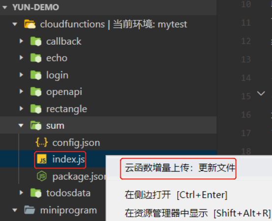 打开 sum 云函数目录下的 index.js,添加 sum:event.a+event.b,到 return 函数里。然后在index.js上右键选择“云函数增量上传:更新文件”,更新sum云函数。
