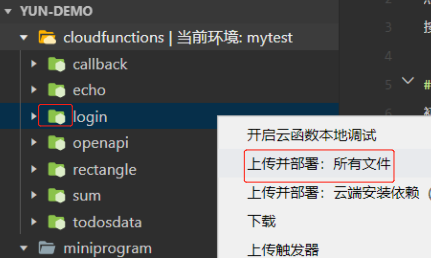 npm install命令下载依赖文件; - 然后再右键云函数目录,点击“上传并部署:所有文件”