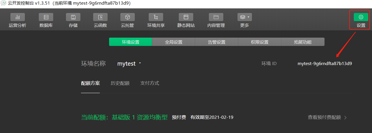 点击微信开发者工具的“云开发”图标,在弹出框里点击“开通”,同意协议后,会弹出创建环境的对话框。这时会要求你输入环境名称,以及当前云开发的基础环境配额。