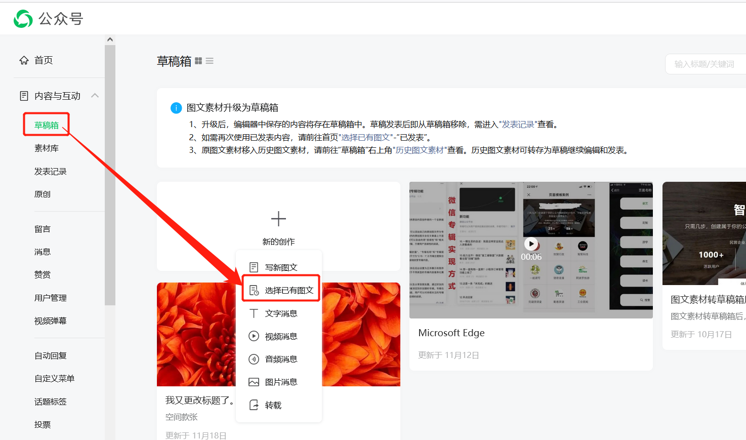 您给的操作流程不太符合现实呢,因为草稿里面没有‘已有图文’选项呀