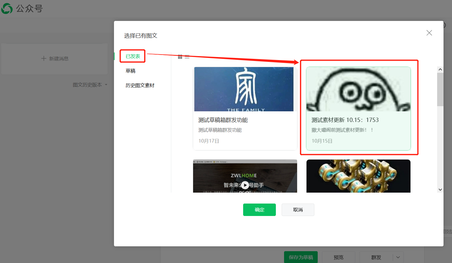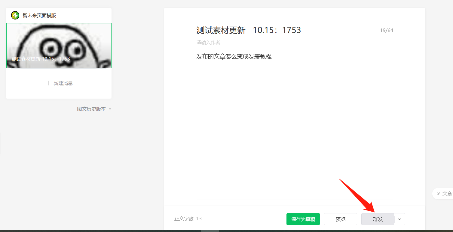 那么不小心点了已经发布的文章,怎么改成群发呢(例如想在历史消息里面给搜索到),步骤很简单: