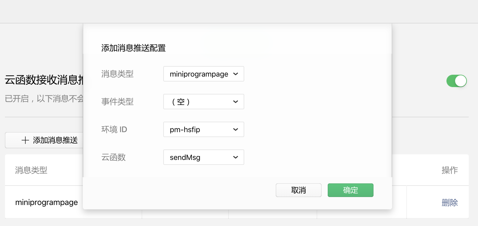 4.设置消息推送,路径如下 云开发-设置-全局设置-云函数接收消息推送 中添加消息类型为miniprogrampage,绑定云函数为新建的云函数。