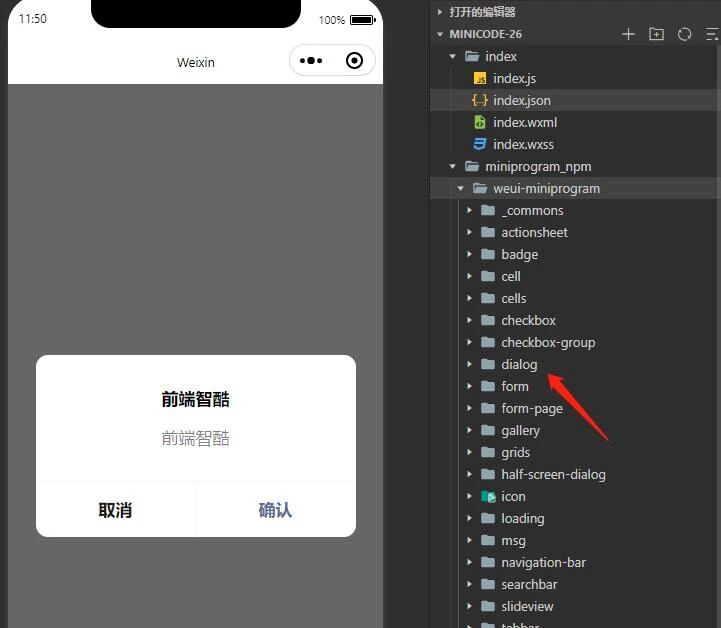 <mp-dialog title="前端智酷" show="{{true}}" bindbuttontap="tapDialogButton" buttons="{{[{text: '取消'}, {text: '确认'}]}}">