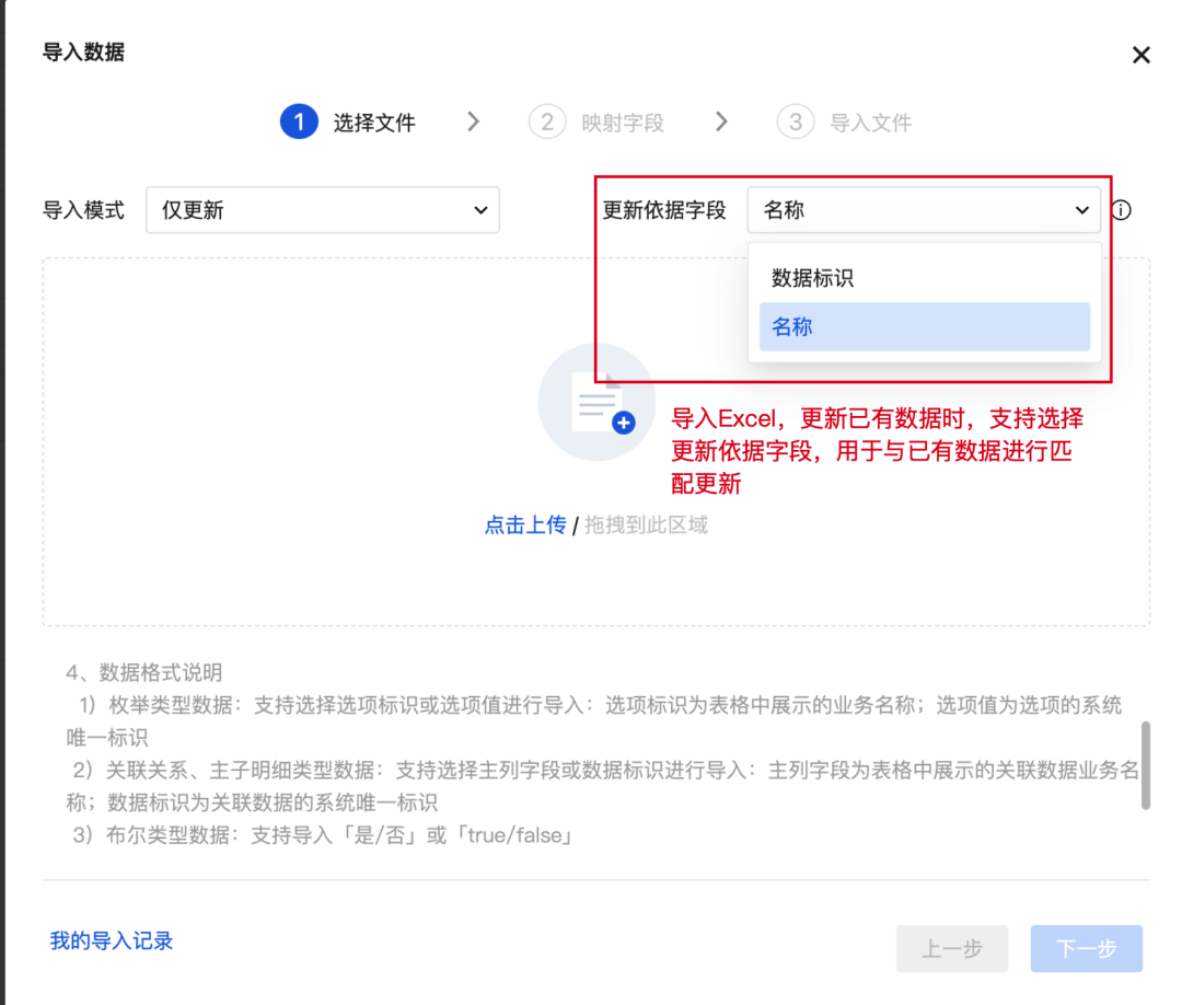 数据表格组件,导入数据时,可灵活制定某字段,对已有数据进行匹配更新。